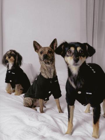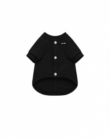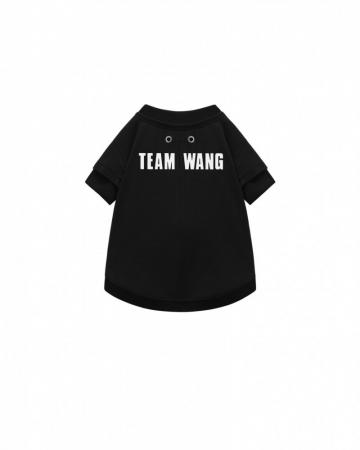 采用柔软透气的棉混纺面料,适合日常穿着,并提供多种尺寸以适配不同体型的宠物。胸前按扣设计方便穿脱,罗纹领口、袖口与下摆提升贴合度与舒适感;背部牵引用开口进一步增强实用性。金属标牌与背部标志性 “TEAM WANG” 印花搭配银色五金细节,呈现品牌一贯的精致风格。